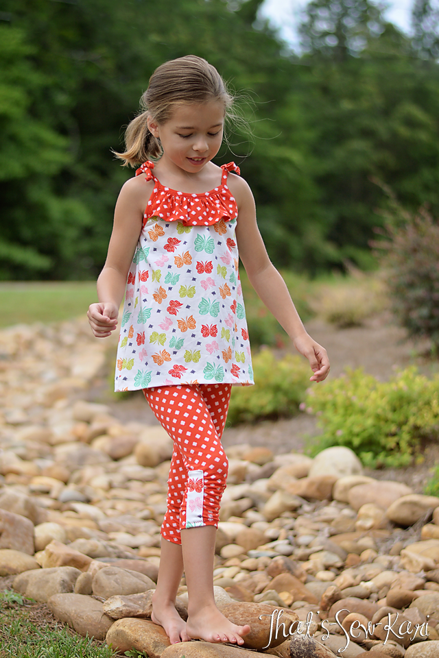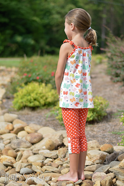 Next up, we have Modkid's newest patterns -- the Laguna Summer Top Collection (View B) and the Perfect Leggings in Capri length. The fabrics I chose were Flutter (in multi) and Bloom Dot (in red). My 7-year old loves butterflies and looks great in red!