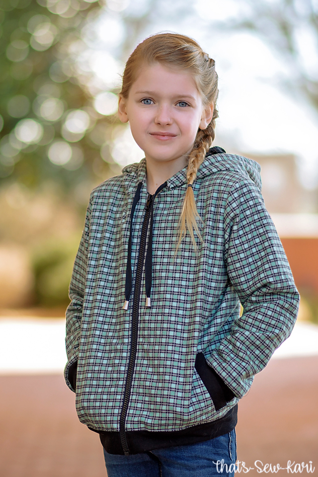 This time I tried out the hood add-on and added a drawstring and grommets. The flannel is super soft and was very easy to work with. I found the plaid to be fairly easy to match up and cut evenly, but I did have to manipulate it slightly after washing/drying to keep the plaid straight with my pattern pieces. I found it easiest to cut along the plaid for the straight edge of the bottom and then making sure the straight sides aligned evenly with plaid.